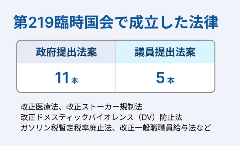 臨時国会で成立した法律は合計16本。政府(内閣)提出法案は、継続審査になっていた改正医療法を含め計11本が成立。議員提出法律案は、継続審査になっていたガソリン税暫定税率廃止法を含め計5本が成立しました。